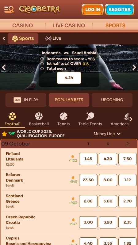 Cleobetra ir piemÄrots spÄlÄtÄjiem, kuri novÄrtÄ plaÅ”u sporta notikumu klÄstu, kvalitatÄ«vus koeficientus, modernus bonusus un iespÄju veikt likmes arÄ« ar kriptovalÅ«tÄm. Platforma Ä«paÅ”i patiks tiem, kas meklÄ stabilu āLiveā likmju pieredzi un vizuÄli pievilcÄ«gu vidi.