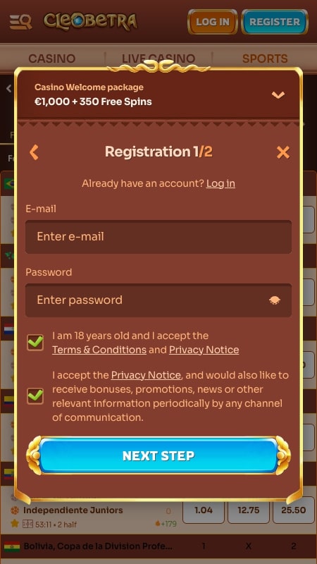 Atveriet vietni un uzsÄciet reÄ£istrÄciju Dodieties uzāÆcleobetra.comāÆun augÅ”ÄjÄ labajÄ stÅ«rÄ« nospiediet zilo poguāÆREGISTER. ReÄ£istrÄcijas formÄ varÄsiet izvÄlÄties sporta vai kazino bonusu, vai arÄ« atteikties no bonusa. Promo kods nav obligÄts.