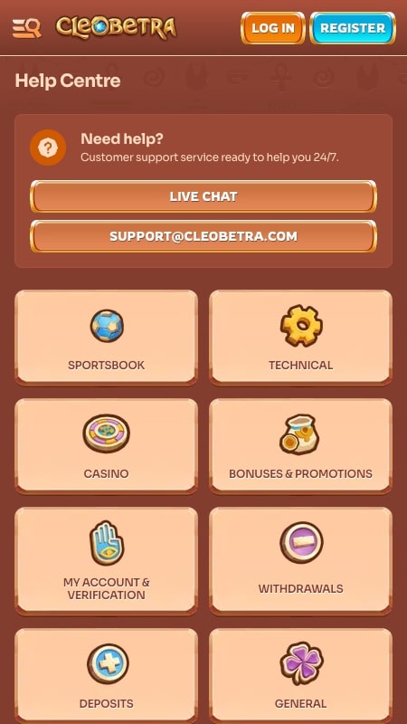 Atbalsts un atbildÄ«ga spÄle JautÄjumu gadÄ«jumÄ izmantojiet 24/7 tieÅ”saistes Äatu vai rakstiet uzāÆsupport@cleobetra.com. Ja vÄlaties paÅ”izslÄgÅ”anos vai konta bloÄ·ÄÅ”anu, sazinieties ar atbalstu ā jÅ«su pieprasÄ«jums tiks izpildÄ«ts.