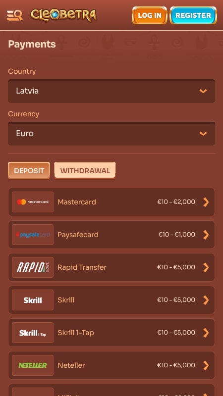 Cleobetra piedÄvÄ plaÅ”u maksÄjumu metožu izvÄli gan iemaksÄm, gan izmaksÄm, nodroÅ”inot jums ÄrtÄ«bas un elastÄ«bu finanÅ”u operÄcijÄs. Iemaksas ar lielÄko daļu metožu tiek veiktas nekavÄjoties.