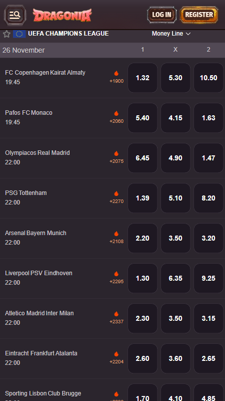 Platforma piedÄvÄ likmes vairÄk nekÄ 20 sporta un e-sporta veidos, apvienojot konkurÄtspÄjÄ«gas likmes ar lietotÄjam Ärtu dizainu un plaÅ”Äm maksÄjumu iespÄjÄm, tostarp kriptovalÅ«tÄm. Dragonia izceļas ar 24/7 klientu atbalstu, atsaucÄ«giem bonusiem un mobilo risinÄjumu, kas pielÄgojas jebkurai ierÄ«cei, ļaujot likmju veicÄjiem Ärti piekļūt visiem pieejamajiem tirgiem un funkcijÄm..
