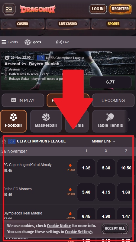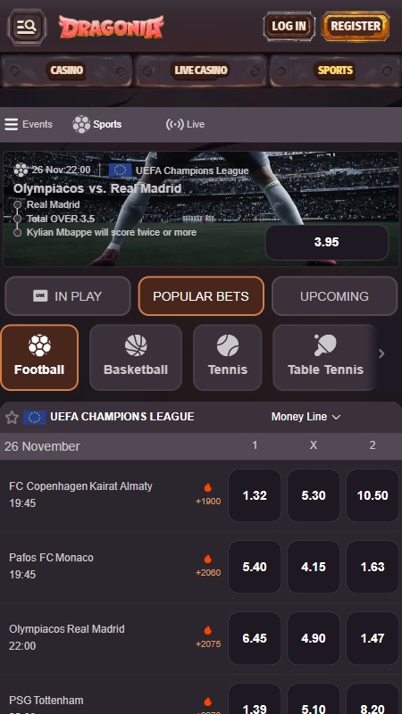 Dragonia live likmju sadaļa ir veidota vienkÄrÅ”i un pÄrskatÄmi, koncentrÄjoties uz populÄrÄkajiem sporta notikumiem ā futbola, tenisa un basketbola spÄlÄm. Koeficienti tiek atjauninÄti reÄllaikÄ, un interfeiss reaÄ£Ä Ätri, ļaujot jums nozÄ«mÄ«gÄs situÄcijÄs likt likmes bez aizkavÄm.