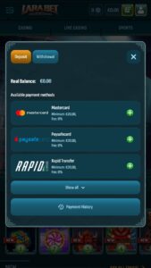 Larabet atbalsta bankas kartes (Visa / MasterCard), e-makus un kriptovalÅ«tas. KonkrÄtÄs metodes un limiti ir atkarÄ«gi no lietotÄja reÄ£iona un verifikÄcijas statusa.