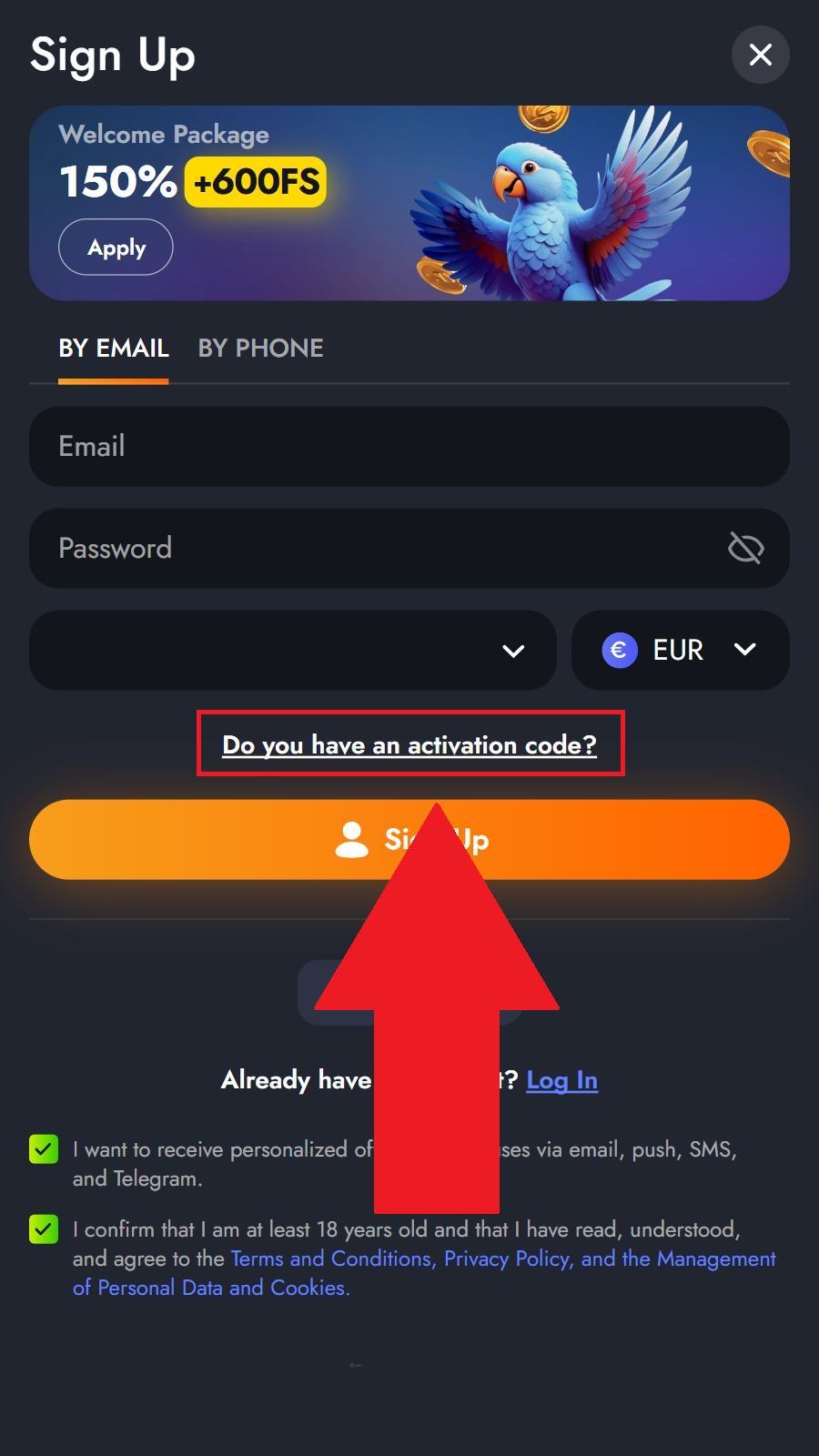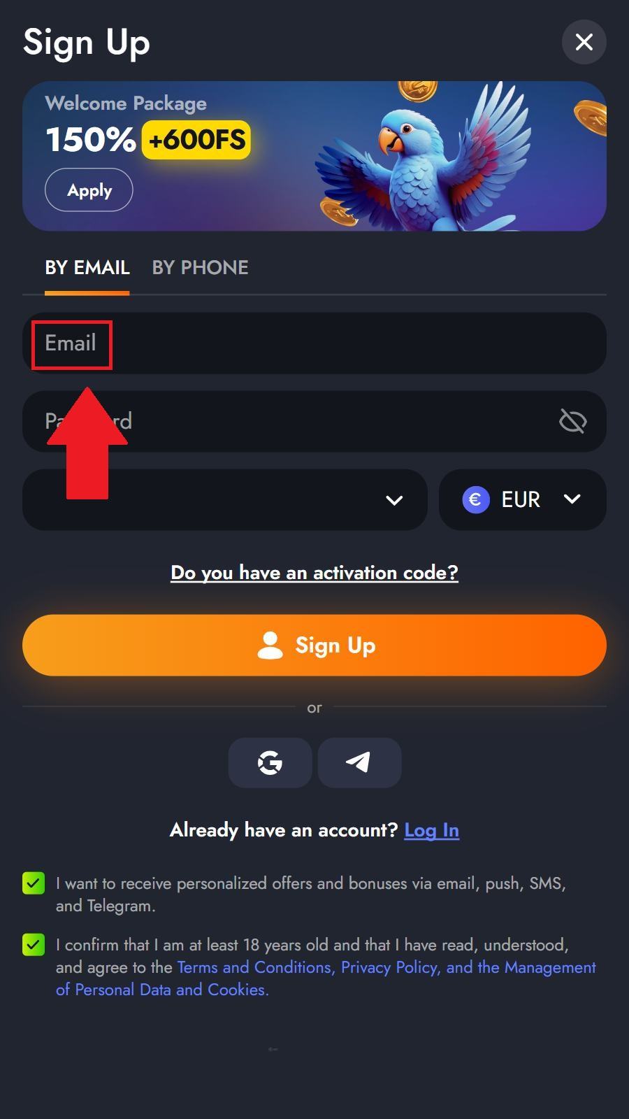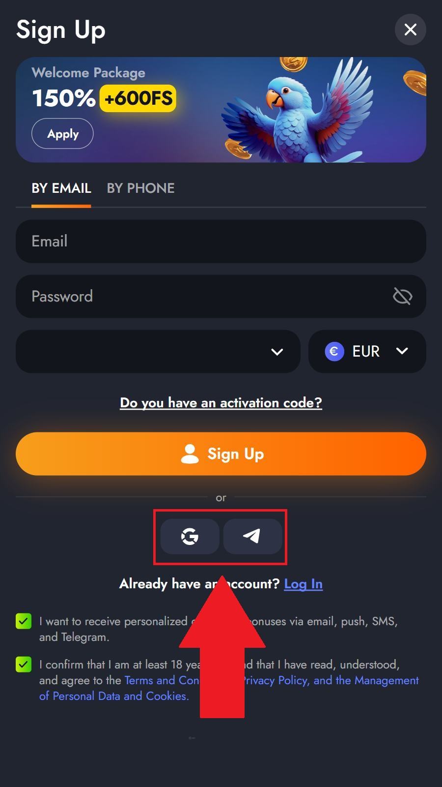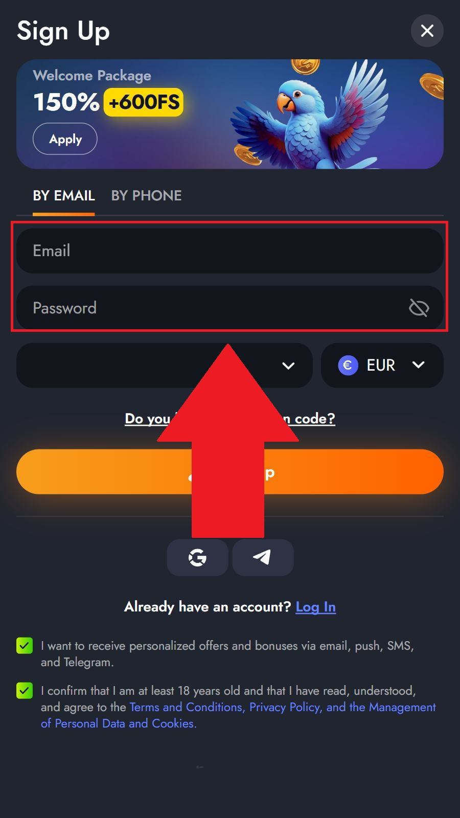Lai pieslēgtos savam lietotāja kontam, jānospiež pogu “Log In” augšējā labajā stūrī. Pēc tam ievadiet savu e-pasta adresi un paroli vai pieslēdzieties ar Google/Telegram kontu.