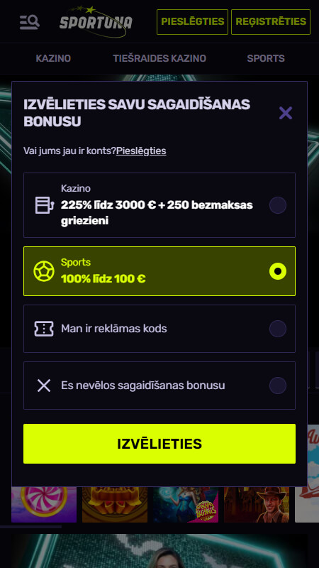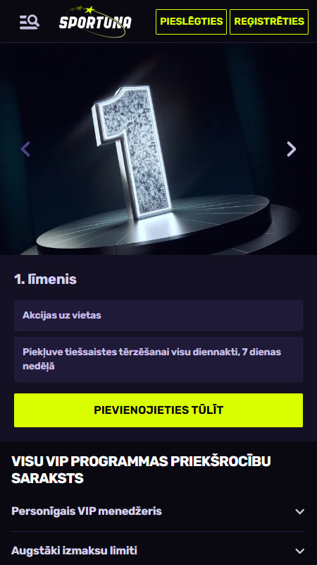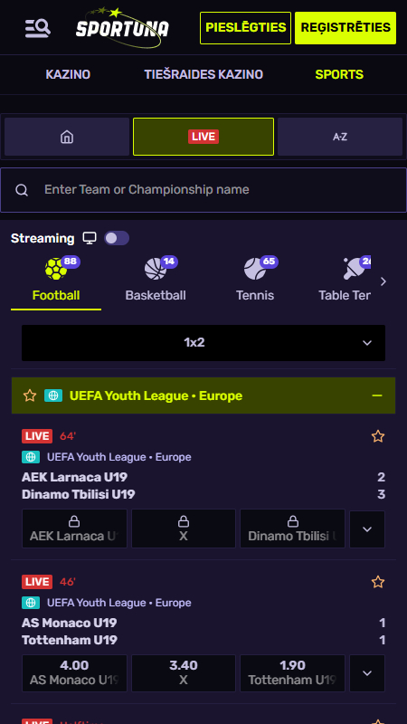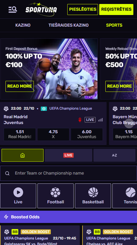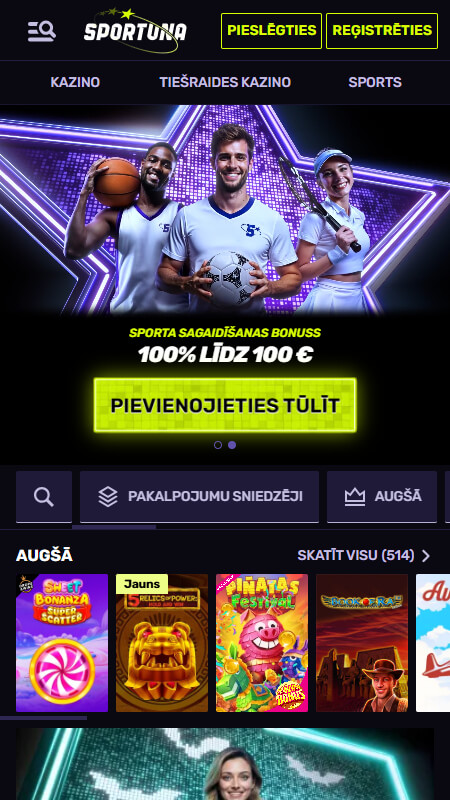Sportuna nepiedÄvÄ mobilo lietotni, taÄu vietne ir pilnÄ«bÄ pielÄgota viedtÄlruÅiem un planÅ”etÄm. ReÄ£istrÄcija, likmes un izmaksas pieejamas bez funkcionalitÄtes ierobežojumiem.